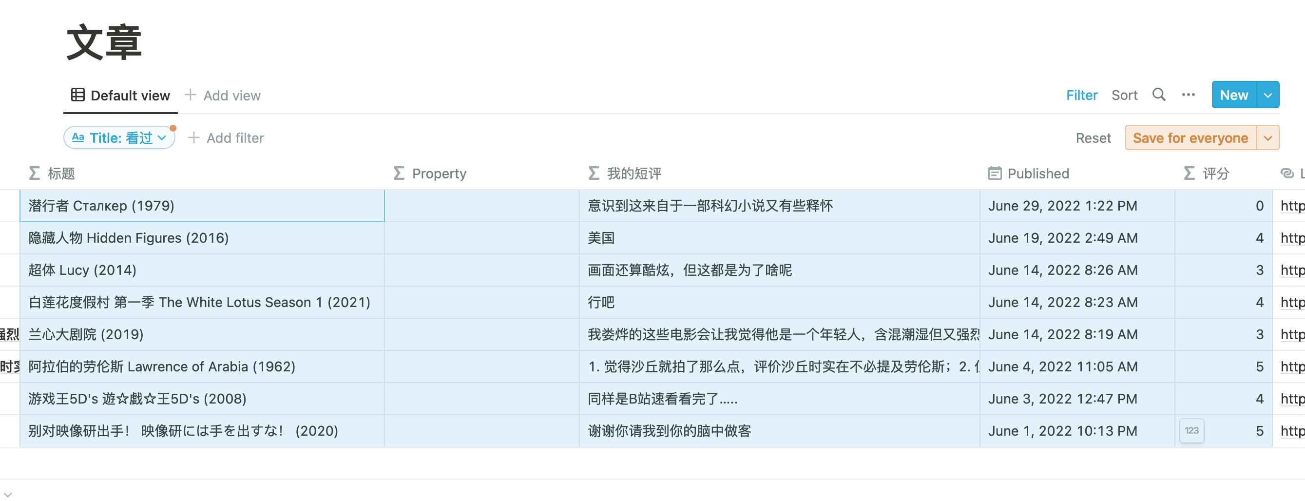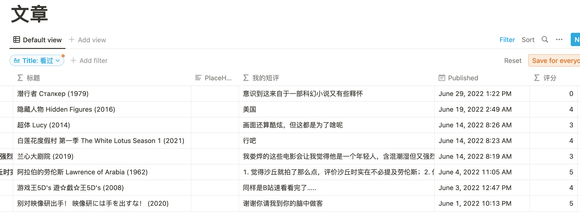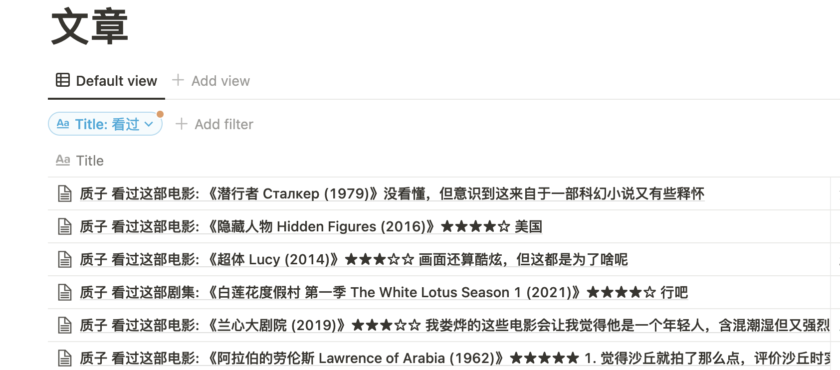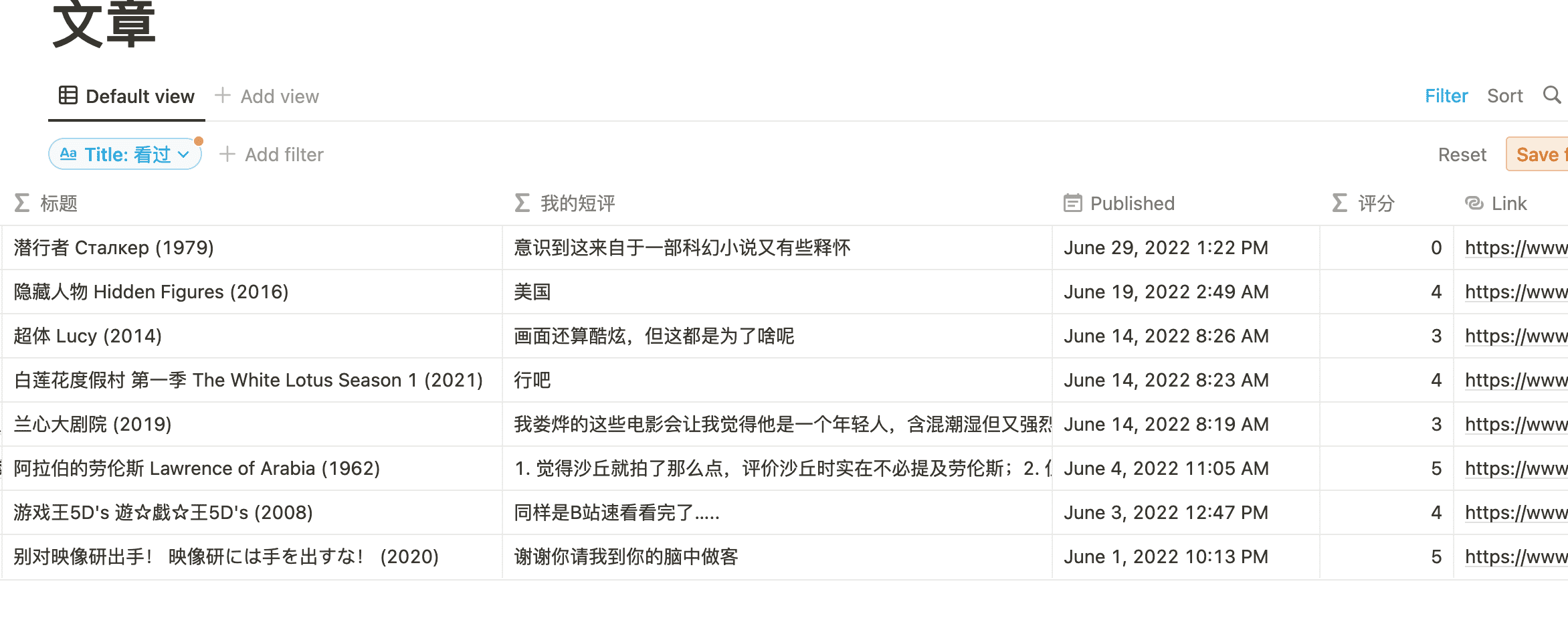 那么我们要做的第一件事是筛选出来影音标记,这个可以通过增加 Filter 实现,想要筛选看过的影音的话,就用「看过」来筛选,同理也可以筛选「听过」、「想看」、「玩过」之类的