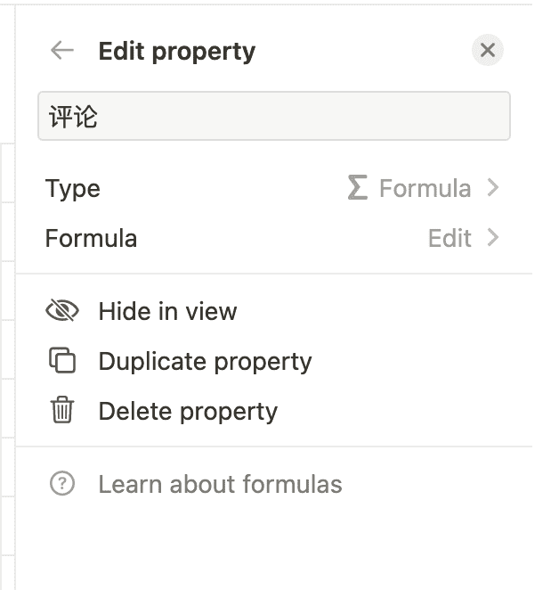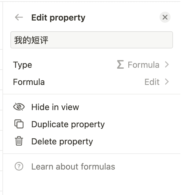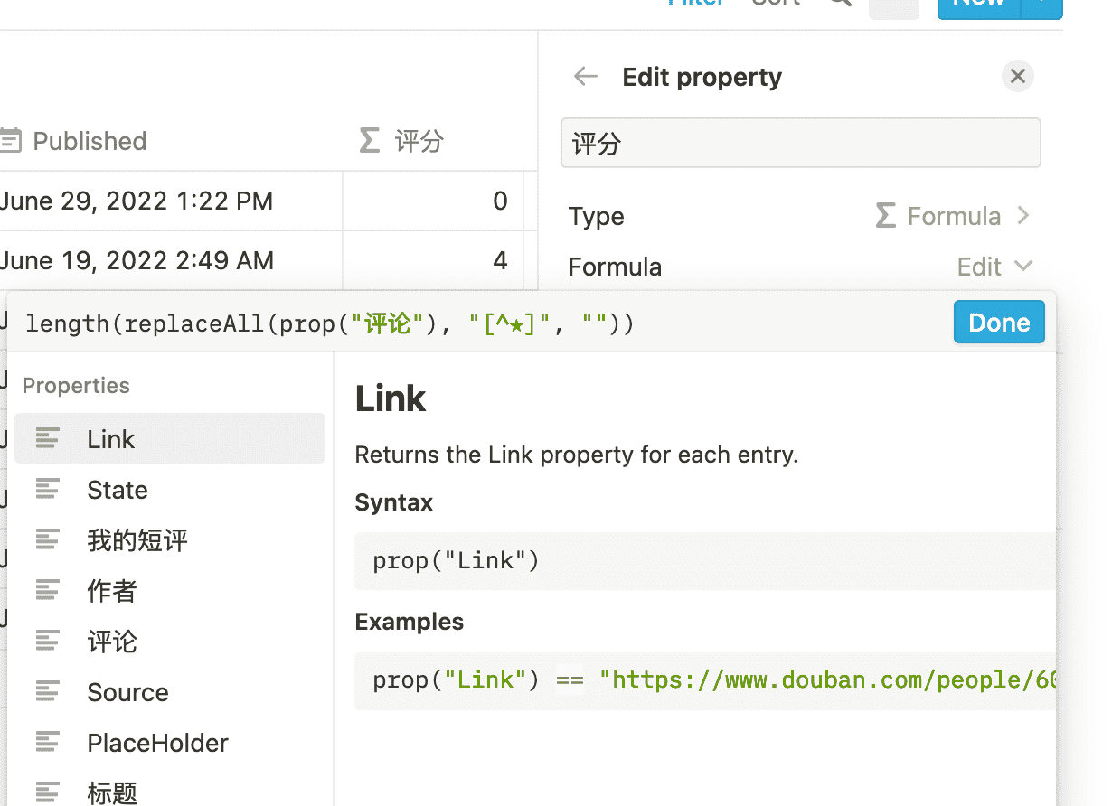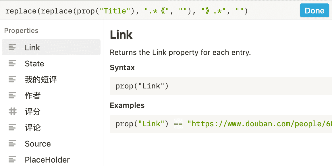 由于书名号之后的就是短评,所以我这里先将打分和评论一起提取了出来,方便下一步处理,也是增加一个 Formula 列,公式为 replace(prop("Title"), ".*》", ""),也就是拿到书名号后面的所有内容