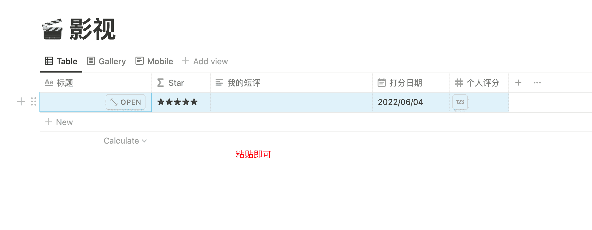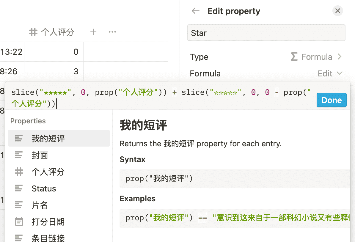 打分这个要麻烦一些,我从豆瓣导出的数据中,是直接的数字而不是★,所以==我在标记 Page 中加了一个公式==, ,将数字转换成星星