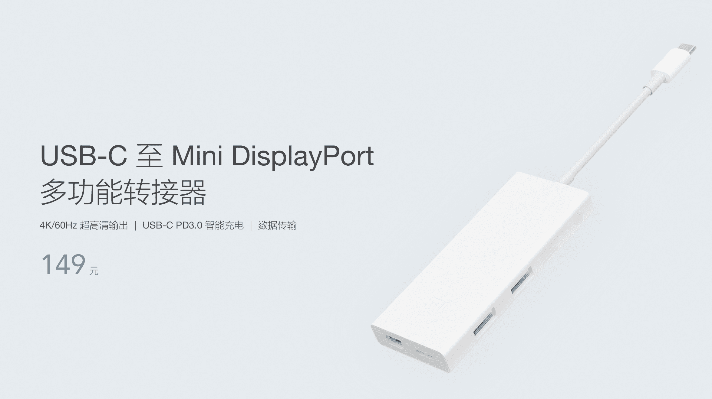 经过我的调研,我发现小米的一款转接器非常合适, USB-C 至 Mini DisplayPort 多功能转接器 ,它可以出来一个 MiniDP、Type-C 和两个 USB 3。0,这样我既可以连接显示器,又可以连接充电器,还能连接两个 USB,长这个样子: